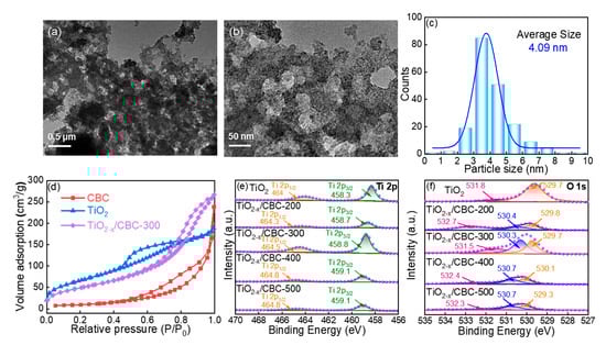 (a,b) TEM images of TiO2−x/CBC-300; (c) size distribution of TiO2−x nanoparticles; (d) N2 adsorption–desorption isotherms of TiO2−x/CBC-300; XPS spectra of (e) Ti 2p and (f) O 1s of TiO2−x/CBC-300 (dot line represents the original data).