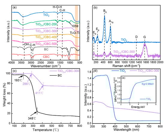 (a) FT-IR spectra of TiO2, BC, CBC, and TiO2−x/CBC under different calcination temperatures; (b) Raman spectra of TiO2, and TiO2−x/CBC-300; (c) TG profiles of BC and TiO2−x/CBC-300; (d) UV-vis DRS spectra and (e) Kubelka–Munk plots of TiO2 and TiO2−x/CBC-300.