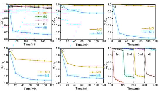 where C0 is the initial MB or MO concentration, and Ct is the MB or MO concentration after the reaction for time t. The separation efficiency for the mixture of organic dyes, which, in this context, represents selectivity, can be evaluated using Equation (2) [43]: