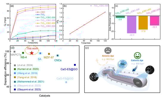 Figure 6a shows the adsorption kinetic curves of MB on CBC, TiO2, and TiO2−x/CBC. Based on the pseudo-second-order fitting plots for MB, within the first 20 min, four TiO2−x/CBC samples reached over 70% of the final saturated adsorption capacity, which indicated the quick adsorption abilities of TiO2−x/CBC. The final saturated adsorption capacities of blank CBC, pure TiO2, TiO2−x/CBC-200, TiO2−x/CBC-300, TiO2−x/CBC-400, and TiO2−x/CBC-500 after 120 min adsorption were 9.6, 11.9, 24.4, 97.2, 91.4, and 87.5 mg/g. In Figure 6b and Table S5, it can be seen that the correlation coefficient (R2 = 0.998) from the pseudo-second-order model is was higher than that from the pseudo-first-order model (R2 = 0.878), indicating that this TiO2−x/CBC system was controlled by liquid film diffusion, as well as internal diffusion and chemical adsorption. Moreover, the Zeta potential of composite is also crucial, particularly for the separation of anionic and cationic dyes. Figure 6c presents the Zeta potential profiles for TiO2−x/CBC across different calcination temperatures. TiO2−x/CBC-200 showed a weak Zeta potential of −2.6 mV, indicating weak electrostatic attraction for cationic dyes, correlating with the poor dye adsorption capacity shown in Figure 5b. In contrast, TiO2−x/CBC-300 achieved the strongest Zeta potential of −22.3 mV, while higher calcination temperatures of 400 °C and 500 °C yielded the Zeta potentials of −17.6 mV and −12.3 mV, respectively. Electrostatic interaction and π–π interaction were determined as the main driving forces, and the 3D cross-linked structure also contributed to the adsorption process. In conclusion, there is a strong dependency relationship among the (i) Vo concentration, (ii) surface electronegativity, and (iii) separation efficiencies. Compared with related publications (Figure 6d, Table S6), our TiO2-BC based material is convenient for synthesis with a higher separation efficiency. A possible mechanism for the high selectivity of TiO2−x/CBC-300 is shown in Figure 6e. From a preparation perspective, the carbonization temperature (Tc) plays a key role in adjusting the selective adsorption effects of anionic/cationic dyes.