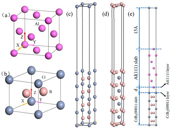 Bulk, surface, and interface structures of Al/CrB2: (a) Al bulk, (b) CrB2 bulk, (c) Cr-terminated CrB2(0001) slab, (d) B-terminated CrB2(0001) slab, (e) Al(111)/CrB2(0001) interface structure.