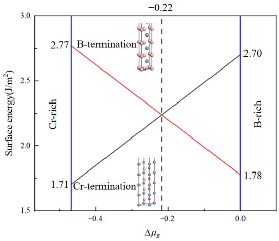 Figure 2 illustrates the relationship between the surface energy of CrB2(0001) surface models with different terminations and the chemical potential difference. It is observed that the surface energy exhibits varying trends with changes in the chemical potential difference.
