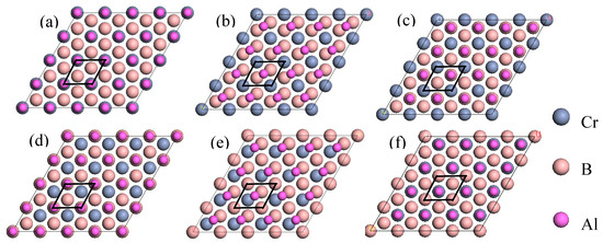 The locations of interfacial atoms of the Al(111)/CrB2(0001) interface: (a) Cr-terminated OT; (b) Cr-terminated MT; (c) Cr-terminated HCP; (d) Cr-terminated OT; (e) Cr-terminated MT; (f) Cr-terminated HCP.