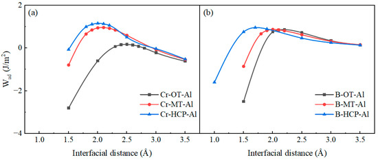 Using the equilibrium separation distance (d0) determined from Figure 4 as a reference, a comprehensive relaxation procedure was applied to investigate multiple stacking arrangements of Cr- and B-terminated configurations. The interfacial distance derived from the UBER approach formed the foundation for subsequent structural refinement of the interface system. Following convergence to a stable configuration, the adhesion work and interfacial energy were calculated for the optimized structure. These quantitative outcomes are systematically summarized in Table 5.