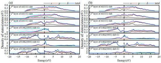 This investigation employed partial density of states (PDOS) analysis to examine the electronic characteristics of the Al(111)/CrB2(0001) interface, providing insights into interfacial bonding mechanisms and charge transfer phenomena. Figure 6 presents the PDOS distributions for HCP-stacked interfaces with Cr- and B-terminations, where the Fermi level is marked by a vertical dashed line. Specifically, Figure 6a depicts the density of states (DOS) corresponding to Al-2p orbitals in the outermost Al(111) layer and Cr-3d orbitals in the surface layer of CrB2(0001). These states exhibit unique features distinct from bulk atoms, revealing hybridization between Al-2p and Cr-3d orbitals. Particularly, near the Fermi level, the PDOS of Cr-3d orbitals in the third CrB2(0001) layer shows a pronounced peak with substantially greater intensity compared to interior Cr atoms. This finding, along with the charge density differences presented in Figure 6a, indicates that the Cr-HCP-Al interface exhibits electronic properties consistent with metallic bonding characteristics.