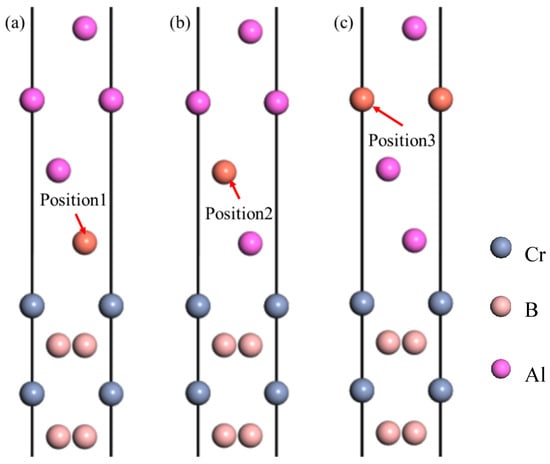 In the study presented here, we initially explored the pristine Cr-terminated HCP-stacked Al(111)/CrB2(0001) interface structure through computational simulations. This investigation was further expanded to assess the effects of doping with common aluminum alloying elements, including Cu, Mn, Si, Mg, Zn, and Fe, by substituting these elements for Al atoms at the interface. These alloying elements were strategically placed at various locations within the Al(111)/CrB2(0001) interface to evaluate and compare the adhesion work and interfacial energy associated with each configuration. Figure 7 demonstrates the designated doping locations: position 1 corresponds to atomic sites in the outermost Al(111) layer, position 2 to those in the intermediate layer, and position 3 to atomic sites in the innermost layer. For a thorough understanding of the effects of this doping, Table 6 provides a detailed analysis of the adhesion work and interfacial energy across these distinct doping positions, offering insightful perspectives on how different alloying elements can influence the interface characteristics in aluminum-based materials.