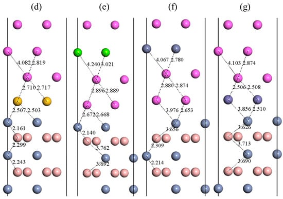 Relaxed interfacial configurations: (a) undoped system, (b) Cu-incorporated interface, (c) Mn-modified structure, (d) Si-doped system, (e) Mg-embedded interface, (f) Zn-substituted configuration, (g) Fe-integrated geometry.
