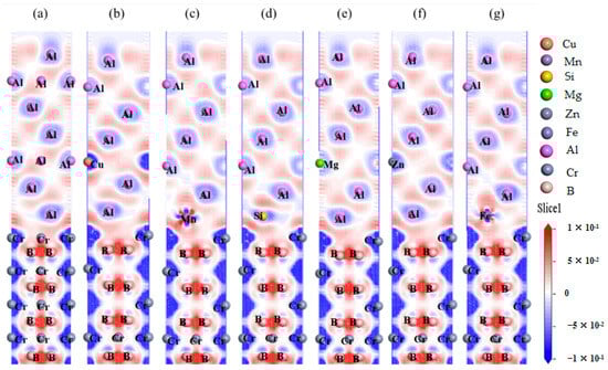 Figure 8a delineates the undoped interface state, where Al atoms in the first layer of the Al(111) slab exhibit bond lengths ranging from 2.664 Å to 3.978 Å with Cr atoms during the relaxation process. Following the doping of the third layer with Cu, Mg, and Zn, the Al atoms in the first layer move closer to the Cr atoms, leading to a decrease in bond lengths post-relaxation. Doping the first layer with Mn, Si, and Fe results in these atoms approaching closer to the Cr atoms, forming Mn-Cr, Si-Cr, and Fe-Cr bonds with notably shorter lengths of 2.644 Å, 2.503 Å, and 2.510 Å respectively, compared to 2.664 Å in the undoped interface. The doping of the interface with alloy atoms such as Cu, Mn, Si, Mg, Zn, and Fe leads to varied lateral displacements among the atoms in the interfacial region when compared to the undoped state.