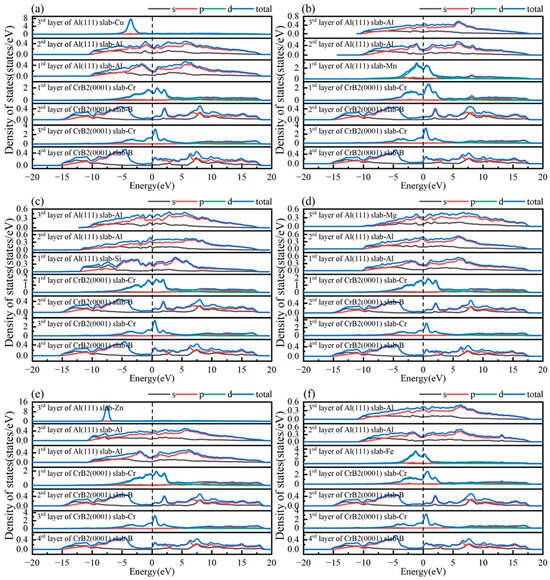 To delve deeper into the bonding attributes of doped alloy atoms at the interface, a PDOS analysis was performed, as illustrated in Figure 10. Relative to the pristine interface shown in Figure 6a, interfaces doped with Mn and Fe display pronounced peak overlap and substantial hybridization effects. The interactions involving Mn-3d, Fe-3d, and Cr-3d orbitals at the interface are intensified. Together with the charge density difference analysis, this firmly establishes the formation of stable covalent bonds at the interface. In contrast, the PDOS curves for Cu-3d and Zn-3d orbitals appear sharp and focused, exhibiting characteristics markedly distinct from those of other layer atoms. At interfaces doped with Cu and Zn, the absence of significant peak overlap suggests a reduction in binding capacity post-doping, potentially compromising interface stability. This observation aligns with the insights gained from the charge density difference analysis. The PDOS profiles for Si- and Mg-doped interfaces largely mirror those of the undoped interface.