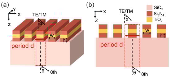 The design and simulation of the grating are implemented using the finite element analysis software COMSOL Multiphysics 5.6. The frequency domain electromagnetic waves interface from the wave optics module was employed as the computational physics field. Periodic boundary conditions were implemented to account for the periodic nature of the grating configuration. The subwavelength grating-based edge filter proposed in this work adopts a three-layer rectangular all-dielectric metasurface architecture fabricated on a fused silica substrate. Figure 2a presents a cross-sectional view (2D schematic) of the device, while Figure 2b shows its perspective 3D schematic. The top and bottom layers of the grating ridges are composed of silicon nitride (Si3N4), while the middle layer consists of titanium dioxide (TiO2). The grating grooves are filled with air, which has a refractive index of 1.00. The thickness of each layer of the grating ridges is , the ridge width is , and the grating period is . Incident light is introduced at an angle .
