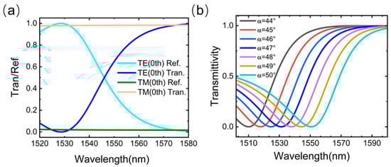 As demonstrated in Figure 3a, at an incident angle of, the wavelength-dependent transmittance and reflectance of the designed subwavelength grating exhibit distinct behaviors for transverse electric (TE) and transverse magnetic (TM) modes. It can be observed that over the range of 1530–1570 nm: For the TE mode, the transmittance of the grating increases linearly with wavelength, while the reflectance decreases in a complementary linear fashion. For the TM mode, the grating achieves nearly full transmission. To minimize measurement errors and enhance sensitivity, the system incorporates a polarizer to selectively propagate TE-mode light. Figure 3b reveals that the angular tuning of the incident light induces a spectral shift in the grating’s transmission curve. This angle-dependent tunability enables dynamic adjustment of the filter’s operational wavelength range, significantly enhancing its compatibility for practical applications.