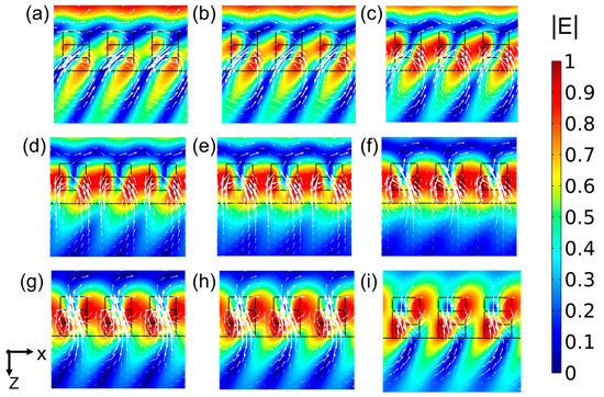 Distribution of the TE-polarized electromagnetic field (white arrows indicate the direction of the magnetic field), corresponding to the wavelength of the incident light 1500 nm (a), 1515 nm (b), 1530 nm (c), 1545 nm (d), 1550 nm (e), 1560 nm (f), 1570 nm (g), 1575 nm (h), 1590 nm (i).