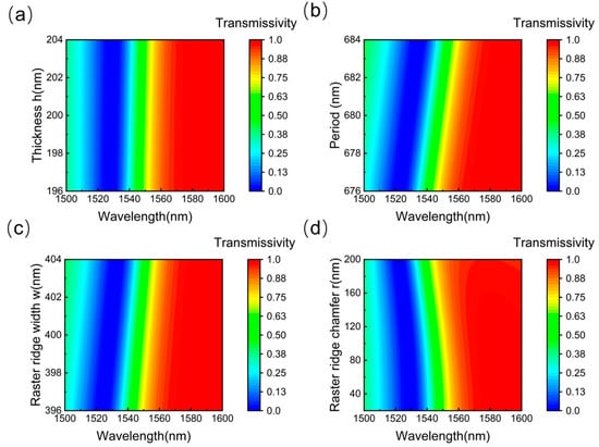(a) The effect of grating layer height variations on transmittance. (b) The effect of grating period variations on transmittance. (c) The effect of grating ridge width variations on transmittance. (d) The effect of grating ridge chamfer variations on transmittance.