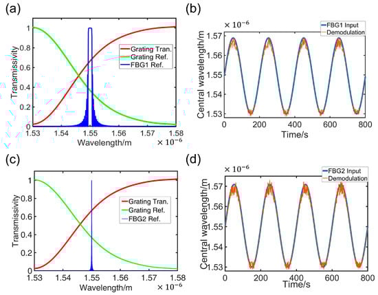 In this paper, numerical simulation was conducted using different FBGs. The simulation parameters were configured as follows: grating period and fiber effective refractive index . Through systematic parameter variation in grating length () and effective refractive index modulation depth (), two distinct FBG reflection spectra with customized full-width at half-maximum (FWHM) characteristics were obtained: FBG1: , , FBG2: ,. These differences manifest primarily in the bandwidths of the FBGs, as illustrated in Figure 7a,c.