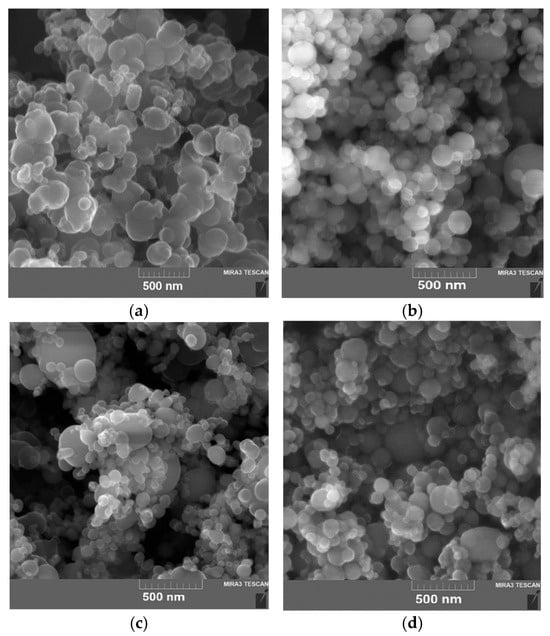 The SEM images of B, Al, Ti and Fe powders obtained using a TESCAN MIRA 3 LMU, Brno, Czech Republic, scanning electron microscope (SEM) are presented in Figure 1. The powders used had spherical particles with a protective layer. Boron particles tend to aggregate and form larger micro-sized particles (1–2 μm) with a high SSA of 9–15 m2 g−1. The average diameter and SSA of the B particles were 210–230 nm and 8.6 m2 g−1 and for Al, Fe and Ti were 90–110 nm and 15.5, 7.7 and 13.8 m2 g−1, respectively (the manufacturer’s data).
