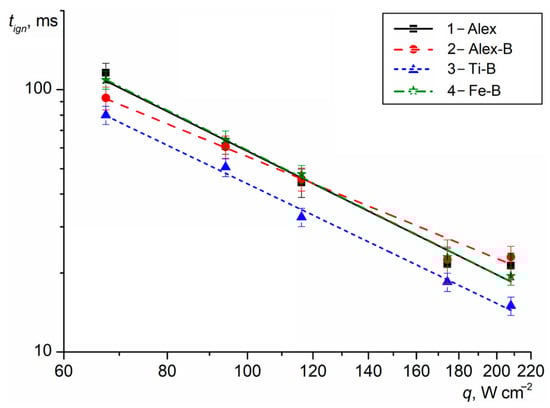Thus, the ignition efficiency by using Me-B UFPs in HECs can be represented as a series: at q = 65 W cm−2, [tign HEC-3, Ti-B] < [tign HEC-2, Al-B] < [tign HEC-4, Fe-B] ≈ [tign HEC-1, Alex] and at q = 210 W cm−2, [tign HEC-3, Ti-B] < [tign HEC-1, Alex] < [tign HEC-4, Fe-B] < [tign HEC-2, Al-B].