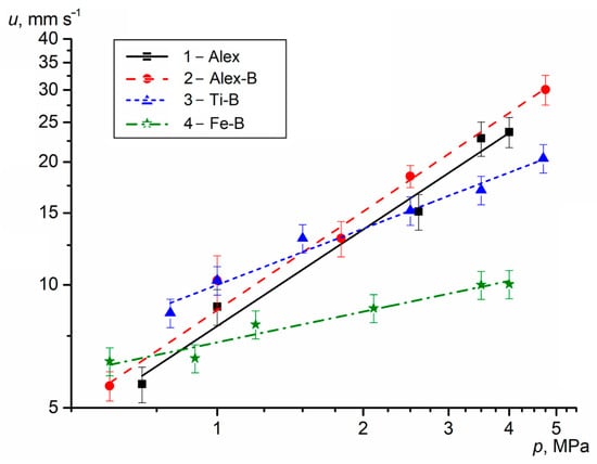 The u is an important characteristic for HECs and SPs affecting the outflow rate of combustion products from the HECs surface and the outflow rate of combustion gas products from the engine nozzle. The u of the HECs is measured at different excess pressures p in a constant-pressure bomb. The average measured values (points) of the u for the HECs with Me UFPs as a function of pressure are presented in Figure 3. The experimental data were used in obtaining the burning rate law as u(p) = b · pn.