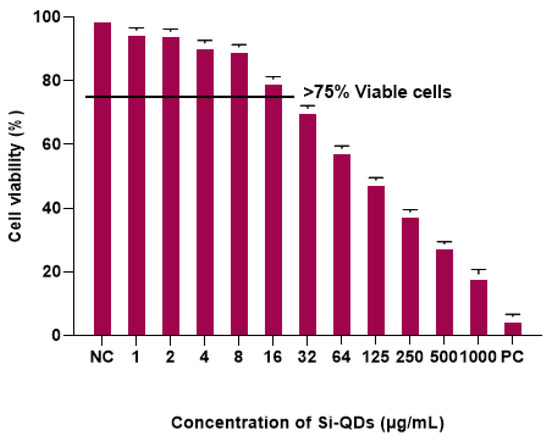 MTT assay: Cell viability (%) of human corneal epithelial cells (HCECs) after exposure to different concentrations of Si-QDs. The horizontal line indicates a cut-off cell viability of more than 75%. Negative control, NC positive control (PC).