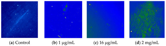 The control solution (TheraTears®), devoid of Si-QDs, exhibited no detectable fluorescence signal (Figure 4a). Si-QDs emitted green fluorescence at all given concentrations with scattered fluorescence emission at 16 μg/mL and above. However, Si-QDs appeared to be aggregated at higher concentrations resulting in dispersed fluorescence (Figure 4d).