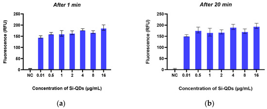 Figure 5 illustrates the emission of green fluorescence from Si-QDs at 1 min (Figure 5a) and 20 min (Figure 5b) following their addition to TheraTears®. The average fluorescence intensity was 183 RFU at 1 min and 176 RFU at 20 min. The fluorescence intensity of Si-QDs was stable over the 20 min observation time (p < 0.05).