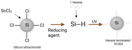 Briefly, as shown in Figure 8 Si-QDs were doped with four scandium atoms per QDs molecule by adding 0.5 g of tetraoctylammonium bromide and 0.026 mmol of ScCl3 to a Schlenk tube. The Schenk tube underwent three evaluation cycles along the Schlenk line, followed by 5 min of Nitrogen purging per cycle. A total of 50 mL of anhydrous toluene was added, stirring the solution for 24 h. Silicon tetrachloride was added, and the solution was again stirred for an hour. Lithium aluminium hydride (reducing agent) was added, allowing the solution to react for 3 h. This resulted in hydride Si-QDs doped with Sc. Hydrophobic quantum dots were created by modifying silicon hydrogen bonds by adding 0.1 mol hexachloroplatinic acid in isopropyl alcohol and 1-heptene [48]. The samples for Transmission Electron Microscopy (TEM) were prepared by drop-casting doped Si-QDs in 0.5–1.0 mL of hexane onto carbon-coated copper grids. The emission spectrum is used to obtain the most significant emission wavelengths.