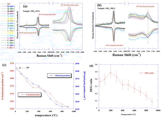 (a) (left figure) single layer graphene and (b) (right figure) multilayer graphene on SiO2 substrate. The relationship between the spectrum during heating and cooling is shown. The results for cooling are inverted to confirm the peak position at each temperature. (c) is the relationship between temperature and peak position of single layer graphene on SiO2 substrate. The peak position of the maximum value for each temperature is noted. (d) is the relationship between temperature and peak intensity ratio. The 2D/D ratio was found to decrease with increasing temperature.