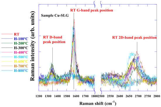 First, the measured graphene sample was either damaged or dissolved into Cu, where carbon has low solid solubility. Second, the Raman spectrum was no longer observed due to the change in the state of graphene surface or in the graphene–Cu foil interface caused by heating. Our previous studies’ optical microscopy images also show the surface in the same temperature range [19]. We believe that the Raman spectrum is no longer observed due to factors such as the desorption of intercalated oxygen, crystal growth of Cu domains, and strain relaxation.