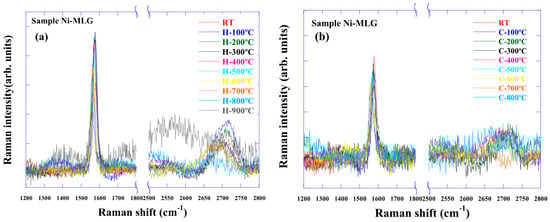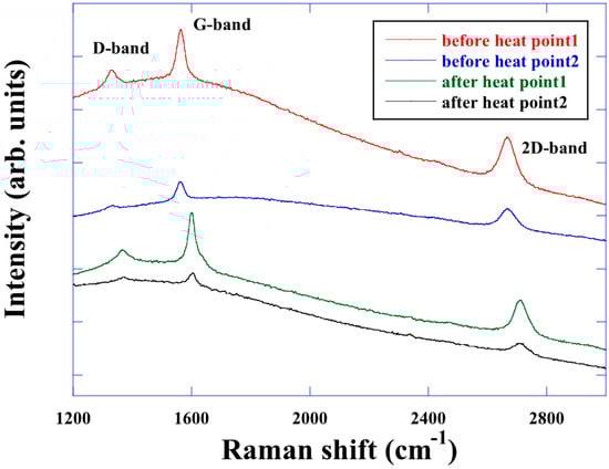 Figure 3 shows the Raman spectra of graphene heated from RT to 900 °C. Up to 700 °C, a peak shift was observed, similar to that of graphene on SiO2. However, the G-band disappeared above 800 °C. Furthermore, Raman spectra could not be observed at 900 °C nor after cooling. Annealing the sample (700–800 °C) has been reported to remove the Cu oxide and restore the crystallographic features of copper surrounding the intact graphene [17], which may have led to the loss of the spectra. The sample was exposed to air, and its Raman spectrum was measured again, as shown in Figure 4. Studies report that, when graphene is exposed to air after vacuum heat treatment, hole concentration increases significantly [18]. Similarly, we observed the reappearance of the G-band and 2D band. From this result, the following is suggested at higher than 700 °C.