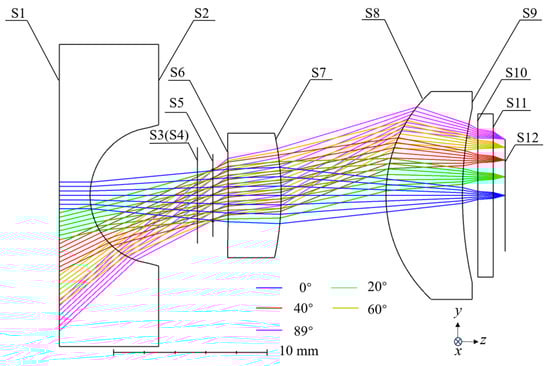 Wide field-of-view (FOV) optical imaging systems in the mid-wave infrared (MWIR) spectrum are crucial in various fields, including environmental monitoring, autonomous driving, medical imaging, and aerospace. Early optical designs primarily utilized fisheye and panoramic lenses, achieving a wide FOV by selecting suitable lens parameters or employing specific configurations [1,2,3]. However, these systems frequently suffer from substantial aberrations, chromatic distortions, and image artifacts that prevent the realization of high-quality imaging. Researchers have introduced aspherical and diffractive optical elements to mitigate these issues, significantly reducing aberrations and enhancing imaging clarity and uniformity [4,5,6,7]. Aspherical lenses provide a more consistent image plane over an expanded FOV, while diffractive optics leverage specially designed optical structures to broaden the range of applications further. Additionally, microlens array systems effectively achieve a wide FOV imaging by integrating numerous small lenses, facilitating three-dimensional imaging and depth information acquisition [8,9,10,11]. Nevertheless, these systems encounter several challenges, including increased optical path complexity and packaging difficulties due to the spacing between micro-lenses.