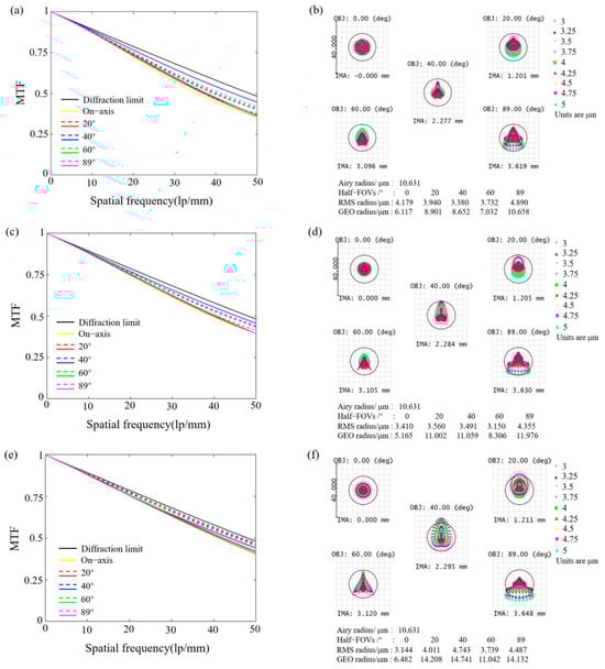 Imaging characterization of the system. (a,c,e) Optical MTF for different half-FOV (dashed curves: tangential MTF; solid curves: sagittal MTF) at operating temperatures of −40 °C, 0 °C, and 60 °C, respectively. (b,d,f) Spot diagram for different half-FOV within the same temperature range.