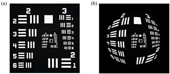 To further demonstrate the imaging performance of the designed hybrid system, a 780 × 780 pixels USAF 1951 resolution test chart was employed as the input to analyze the full 178° FOV imaging results, as shown in Figure 3. The comparison between the ground truth image (Figure 3a) and the output image (Figure 3b) reveals exceptional sharpness, well-defined details, and clear contours. Notably, the system’s ultra-wide 178° FOV introduces geometric distortion that progressively intensifies toward the image periphery. However, this distortion does not degrade the intrinsic resolution and can be corrected through post-processing algorithms.