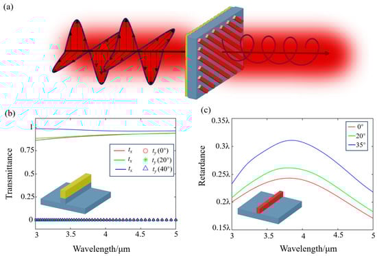 To further reduce the system size and enhance its integration level, a circular polarizer is designed using a bilayer metasurface, which is equivalent to a linear polarizer and a quarter-wave plate, as shown in Figure 4a. Figure 4b illustrates the polarization response of the linear polarizer under the incidence angles of 0°, 20°, and 40°, where the transmittance is greater than 0.86 for x-polarized light and close to 0 for y-polarized light. Furthermore, the average polarization extinction ratio (PER) across the operational band is calculated to be 62.4 dB, 53.5 dB, and 60.1 dB for incidence angles of 0°, 20°, and 40°, respectively. As shown in the inset, a double-layer grating structure is employed to achieve a perfect polarization filtering, the period of the unit structure is 0.35 μm, and the duty ratio is 0.5. The etching depths of Au and MgF2 layers are 0.35 μm and 0.25 μm, respectively. Figure 4c characterizes the phase retardation of the designed quarter-wave plate. One can see that the phase retardation between the x-polarized and y-polarized light maintains approximately 0.25λ, with average phase errors of 0.0282λ, 0.0131λ, and 0.0288λ at incident angles of 0°, 20°, and 35°, respectively. The unit structure has a period of 0.792 μm, and the width and height of the silicon strip are 0.521 μm and 0.82 μm, respectively. Notably, due to the refractive optics, rays at the extreme field (89° half-FOV) intercept the metasurface polarizer at a much smaller angle (~34°). This indicates that the designed polarizer can operate effectively within the angular range. Additionally, the designed metasurface polarizer can be fabricated using existing processes such as electron-beam lithography and nanoimprint lithography. For practical implementation, precise alignment of the metasurface element with the optical axis should be ensured to maintain system performance.