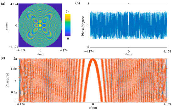 where φ represents the phase, Morder denotes the diffraction order, N is the number of terms in the polynomial series, ρ refers to the normalized radial aperture coordinate, and Ai is the coefficient of the 2i-th power of ρ. In this case, Morder is set to 1st order, N is 4, and ρ is the ratio of r to R, where r is the radius corresponding to different positions on the metasurface phase element. R is the normalized radius, with R set to 1 mm. As a result, the values of A1~A4 are determined to be −24.444293, 1.884176, −0.094382, and 1.575407 × 10−3, respectively.