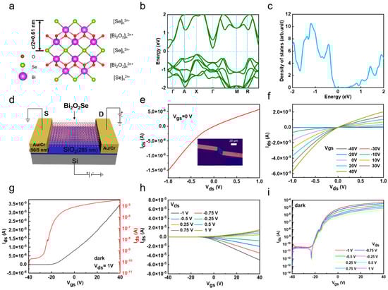 Based on the above CVD-grown Bi2O2Se flakes, we studied their electrical properties by fabricating Bi2O2Se-based FETs. Bi2O2Se is a layered material composed of alternating [Bi2O2]n2n⁺ and [Se]n2n− layers stacked along the c-axis, which form covalent bonds through electrostatic interactions, as visualized in Figure 3a. Previous studies have extensively employed density functional theory (DFT) to calculate the band structure of 2D semiconductors [37,38]. Hence, we used density functional theory (DFT) to calculate the band structure and density of states of Bi2O2Se, revealing that it has an indirect bandgap of approximately 0.34 eV, with the valence band maximum at the X point and the conduction band minimum at the Γ point (Figure 3b,c). It should be noted that the bandgap of bulk Bi2O2Se was measured to be ~0.85 ± 0.05 eV using scanning tunneling spectroscopy (STS) [17]. We then fabricate the back-gated device by transferring Bi2O2Se flakes from mica to a 300 nm thick SiO2/Si substrate. Figure 3d shows a schematic of Bi2O2Se flake-based FETs. Figure 3e shows the output characteristics (Ids-Vds) of the Bi2O2Se device measured at room temperature under zero gate bias, with a current reaching up to approximately 5.75 × 10−6 A at a bias of 1 V, indicating excellent electrical performance. The asymmetry of this curve demonstrates a Schottky barrier existing at the electrode–channel contact interface. The inset of Figure 3e shows an OM image of a Bi2O2Se FET device with a channel length of 18.28 µm and a width of 12 µm. The effective area is 219.36 µm2. When the back-gate voltage was adjusted from −40 V to 40 V in a 10 V step, it was observed that the drain current (Ids) strongly depended on Vgs, demonstrating its back-gate controllability (Figure 3f). The nonlinear features of these Ids-Vds curves further suggests the presence of a Schottky barrier, which may be due to the electrode’s oxidation during the deposition process. Figure 3g shows the transfer characteristics (Ids-Vgs) at a bias voltage Vds of 1 V, displayed in both linear and logarithmic scales. The n-type behavior of the Bi2O2Se device causes Ids to increase (decrease) with a positive (negative) Vgs. The on/off ratio at a bias of 1 V is approximately 4.51 × 105, and the field-effect mobility (µ) extracted from this curve is 129 cm2V−1s−1. Furthermore, Figure 3h,i show the Ids-Vgs curves at various bias voltages Vds ranging from −1 V to 1 V with a step of 0.25 V in both linear and logarithmic scales, further confirming the n-type characteristics of the Bi2O2Se-based FETs. The above results demonstrate the relatively high electronic performance of as-grown Bi2O2Se-based devices.