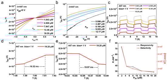 As the laser intensity increases, the photocurrents of both the on state and off state increase a lot, which may be due to the photogenerated electrons in the Bi2O2Se channel. Since the response time is a key parameter for photodetectors, we measured the time-resolved photo response of the photodetectors by periodically turning the laser on and off under different laser powers ranging from 1.843 µW to 19.20 µW. As shown in Figure 4c, the photodetector exhibited good on/off characteristics with excellent repeatability. Additionally, the photoinduced polarization enhancement in Bi2O2Se modulates the Schottky barrier and reduces resistance, causing the dark current to increase with increasing light power. Meanwhile, photogenerated carriers fill trap states, with some carriers remaining trapped, making it difficult for the dark current to recover. Furthermore, the magnified response curves shown in Figure 4d,e were used to calculate the rise and decay times. The rise time is defined as the time taken for the photocurrent to increase from 10% to 90% of Ids (max), and the decay time is the reverse, resulting in a rise time and a decay time of 18.32 ms and 19.97 ms, respectively, for the Bi2O2Se photodetector. For photodetectors, responsivity (R) and detectivity (D*) are important parameters for evaluating performance. Hence, we calculated the R and D* values of the photodetector versus incident laser powers, as shown in Figure 4f. The R value, external quantum efficiency (EQE), noise equivalent power (NEP), and detectivity (D*) were determined using the following equations [40]: