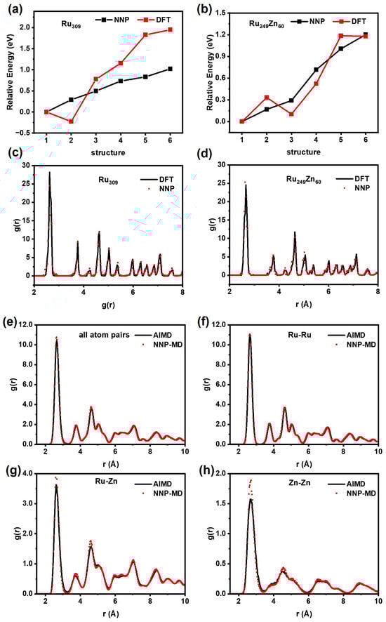 Comparison of HDNNP and DFT. The energy of (a) Ru309 and (b) Ru249Zn60. The pair radial distribution functions of global minimum structure for (c) Ru309 and (d) Ru249Zn60. The pair radial distribution functions of MD simulations for Ru153Zn54 at 700 K for 20 ps, including (e) all atom pairs, (f) Ru−Ru, (g) Ru–Zn, and (h) Zn−Zn.
