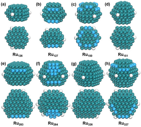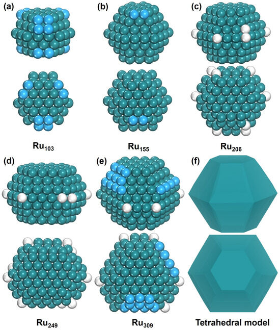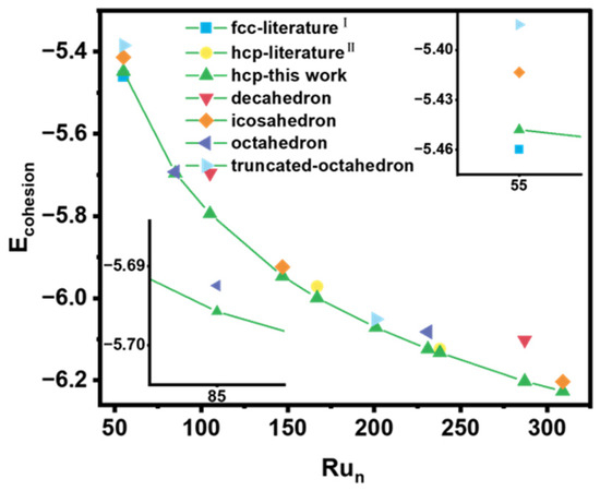 Many scholars and teams have also studied the nanostructure of Ru. Zhang et al. [39] studied the structure of Run (n = 53–58) based on the Wulff construction and proposed that the most stable structure is the FCC-phase structure and compared it with the HCP-phase structure and icosahedral structure. Koyama et al. analyzed the structural stability of the FCC-phase and HCP-phase Ru-NPs with various particle sizes and shapes using DFT. For large sizes, HCP-phase Ru-NPs are the most stable. However, as the number of atoms was less than 103, icosahedral FCC-phase NPs become more stable and dominate.