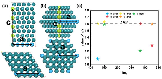 To study the relationship between the structure and stability of Ru nanoparticles with HCP structures, we introduce a new parameter: the ratio of crystal axes c/a. The parameter a represents the length of the hexagonal base edges, and c represents the height of the unit cell along the c-axis, as shown Figure 5. For bulk Ru, the value of c/a is 1.605. For the most stable Ru126 nanoparticle, the c/a value is 1.085, which is significantly smaller than the value of Ru bulk. However, Ru127 has a much larger c/a value of 1.611, which is close to the value of Ru bulk, due to the transformation from five layers to six layers. For Ru150, which is the largest nanoparticle with a six-layer structure, the c/a value is 1.634, with a lot of adatoms on the six (1011) surfaces. The c/a value is slightly larger than the value of Ru bulk. On the other hand, Ru151 is the smallest nanoparticle with a seven-layer structure, and the c/a value is 1.594, slightly smaller than the value of Ru bulk.