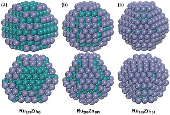 The structure of Ru–Zn bimetallic nanoparticles. (a) Ru249Zn60. (b) Ru206Zn103. (c) Ru155Zn154. The blue-green ball represents Ru atom, and the purple ball represents Zn atom.