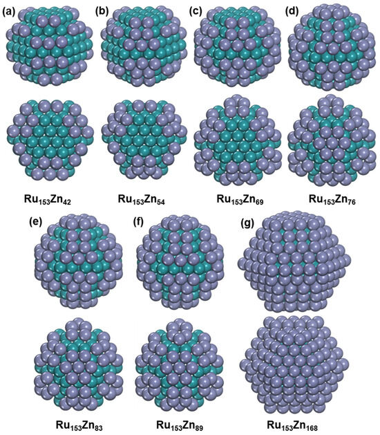 The structure of Ru153Znx bimetallic nanoparticles. (a) Ru153Zn42. (b) Ru153Zn54. (c) Ru153Zn69. (d) Ru153Zn76. (e) Ru153Zn83. (f) Ru153Zn89. (g) Ru153Zn168. The blue-green ball represents Ru atom, and the purple ball represents Zn atom.