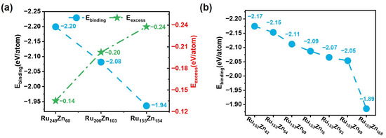 Then, we used average excess energy and the average binding energy of Zn atoms to study the structural stability of Ru-Zn bimetallic nanoparticles. As shown in Figure 8a, the average excess energy of Ru249Zn60, Ru206Zn103, and Ru155Zn154 is −0.14 eV/atom, −0.20 eV/atom, and −0.24 eV/atom, respectively. The negative energies indicate that the considered Ru-Zn bimetallic nanoparticles are more stable than the pure Ru and Zn nanoparticles. On the other hand, the average binding energy of Zn atoms is −2.20 eV/atom, −2.08 eV/atom, and −1.94 eV/atom, suggesting the Ru-Zn interaction is weakened as the Zn/Ru ratio increases.