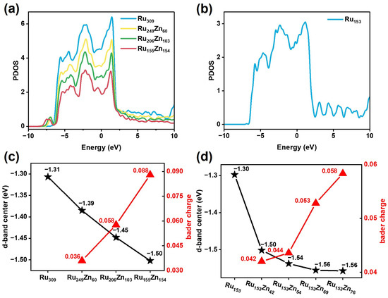 The partial density of states (PDOS) of d orbitals [42] for RunZn309−n is shown in Figure 9a. The PDOS shows a similar distribution of electrons, and it is continuous from −10 eV to 10 eV. The center of the d-band for Ru309, Ru249Zn60, Ru206Zn103, and Ru155Zn154 is −1.31 eV, −1.39 eV, −1.45 eV, and −1.50 eV (Figure 9c). The center of the d-band is far away from the Fermi level with the proportion of Zn increasing. The electronegativity of the Ru element is higher than that of the Zn element. In the Ru–Zn bimetallic structure, electrons are transferred from Zn to Ru, and the electrons gather on Ru to become negatively charged. The average number of Bader charge transfers per Ru atom for Ru249Zn60, Ru206Zn103, and Ru155Zn154 are 0.036, 0.058, and 0.088. As the proportion of Zn increases, the transfer number of Bader charge increases from Zn to Ru.