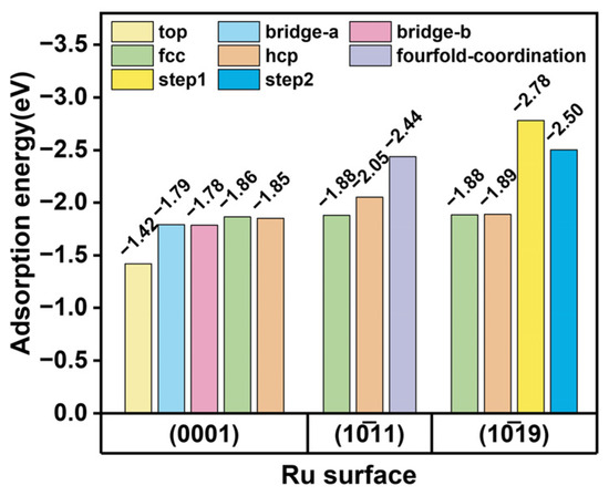 In theoretical calculations, specific crystal planes are usually selected to study the reaction performance. We selected the three crystal planes of Ru to study their structure and properties, including the (0001), (1011), and (1019) surfaces (Figure S16). The HCP phase is the most stable crystal form of Ru, and the Ru cluster consists of the (0001) and (1011) surfaces. The (0001) surface is the close-packed crystal plane of the HCP phase, which is often selected for theoretical calculation. The (1011) surface was characterized in the Ru and Ru–Zn bimetallic catalyst [20,22,36]. The stepped structure is a planar dislocation that forms on the surface of a grain during crystal growth, which is common in some metals and their oxides. Experiments have proved the existence of a step structure and can be used to calculate the step height and density [43,44]. The (1019) surface is the stepped plane of Ru, which belongs to the high Miller index crystal plane; John T. Yates and H.J Jänsch studied the adsorption of N2 and CO on the (1019) surface, which exhibits a unique structure and chemical properties [45,46].