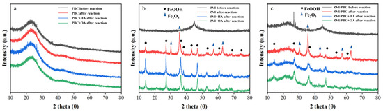 XRD patterns of (a) PBC, (b) ZVI, and (c) ZVI/PBC with the addition of organic acids before and after reaction.