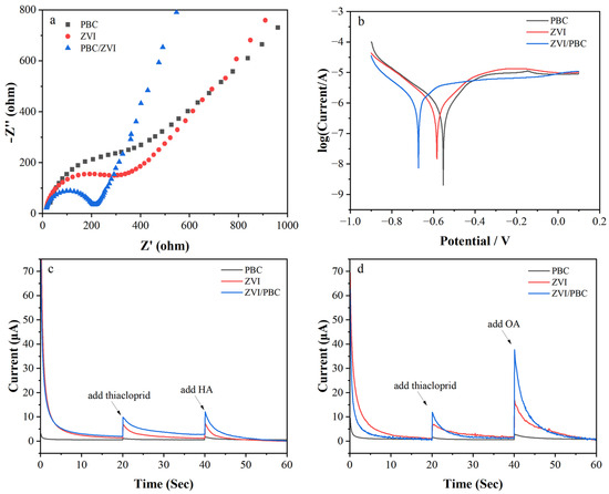 Electrochemical analysis of PBC, ZVI, and ZVI/PBC: (a) electrochemical impedance spectroscopy; (b) Tafel corrosive curves; (c) i–t response curves of added HA; (d) i–t response curves of added OA.