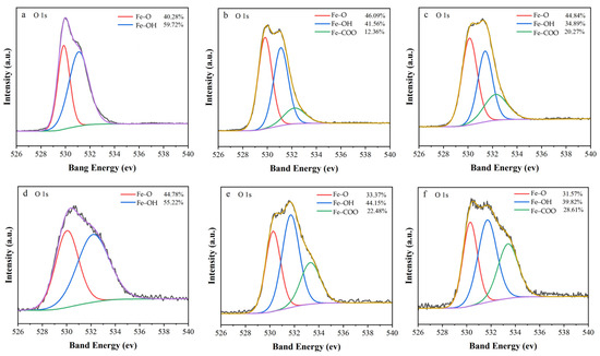 High-resolution XPS spectra of O 1s (a) after ZVI reaction; (b) after adding HA reaction in ZVI; (c) after adding OA reaction in ZVI; (d) after ZVI/PBC reaction; (e) after adding HA reaction in ZVI/PBC; (f) after adding OA reaction in ZVI/PBC.