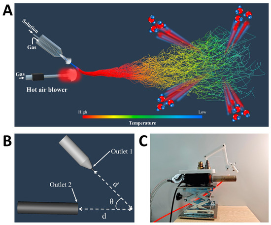 Design of DP-SBS: (A) schematic illustration of DP-SBS equipment; (B) schematic illustration of angle and distance between two nozzles; (C) optical image of DP-SBS equipment.
