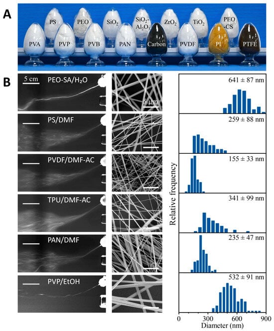 Polyvinyl alcohol (PVA, 1788), polyethylene oxide (PEO, Mw = 5,000,000), sodium alginate (SA, AR), polyacrylonitrile (PAN, Mw = 149,000~151,000), polyvinylidene fluoride (PVDF, Mw = 455,000), polytetrafluoroethylene dispersion (PTFE, 60 wt%), aluminum isopropoxide (C9H21AlO3, 99.99% metals basis), polystyrene (PS, General Purpose Type I), zirconium diperchlorate oxide octahydrate (ZrOCl2·8H2O, AR, 99%), aluminum nitrate nonahydrate (Al(NO3)3·9(H2O), AR 99%), polyvinyl pyrrolidone (PVP, Mw = 1,300,000), and tetrabutyl titanate [Ti(OBu)4, 99%]—all purchased from Aladdin(Shanghai Aladdin Biochemical Technology Co., Ltd., Shanghai, China). Polyethylene oxide (PEO, Mw = 600,000), polyvinyl butyral (PVB, Mw = 90,000–120,000), hyaluronic acid (HA, 97%), and calcium chloride (CaCl2, AR)—all purchased from Macklin (Shanghai Macklin Biochemical Technology Co., Ltd., Shanghai, China). Sodium hydroxide (NaOH, AR), phosphoric acid (H3PO4, AR), hydrochloric acid (HCl, AR), acetone (AC, AR), tetraethyl orthosilicate [(C2H5O)4Si, AR], ethyl alcohol (EtOH, AR), N,N-Dimethylformamide (DMF, AR)—all purchased from Sinopharm Chemical Reagent Co., Ltd. (Shanghai, China). Carboxymethyl chitosan (CS, deacetylation degree ≥ 90%) was purchased from Cool Chemistry (Kool Chemical Technology Co., Ltd., Beijing, China). Sodium citrate anticoagulant rabbit blood was purchased from Nanjing Senbeijia Biological Co., Ltd., (Nanjing, China). Thermoplastic polyurethanes (TPU) were purchased from BASF(BASF SE, Ludwigshafen, GER), Germany. Polyamide acid (PAA, 80%) was purchased from Dongguan Xinmiao New Materials Co., Ltd., (Dongguan, China). The heat gun was purchased from Fuzhou SDANLI Welding Technology Co., Ltd. (Fuzhou, China).