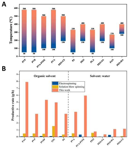 The reasonable temperature and productivity of DP-SBS: (A) reasonable spinning temperatures for different polymers; (B) comparison of production rates (single needle) between DP-SBS, ES, and SBS for different polymers.
