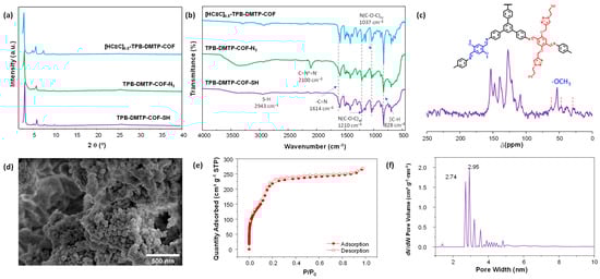 (a) PXRD patterns and (b) FTIR spectra of the precursor [HC≡C]0.5-TPB-DMTP-COF, the intermediate TPB-DMTP-COF-N3, and the final product TPB-DMTP-COF-SH. (c) Solid-state 13C CP-MAS NMR spectra, (d) SEM image, (e) N2 adsorption–desorption isotherms, and (f) pore size distribution of TPB-DMTP-COF-SH.